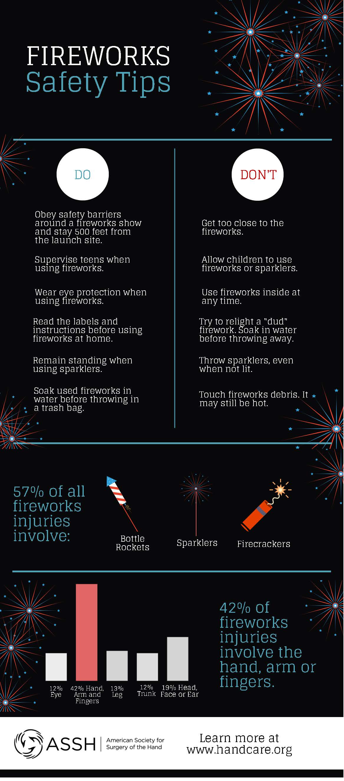 Fireworks can cause death and injury, including burns, contusions, lacerations, and foreign objects in the eye. Make the choice to protect yourself and your family from fireworks injuries by reviewing these firework safety tips from the American Society for Surgery of the Hand: